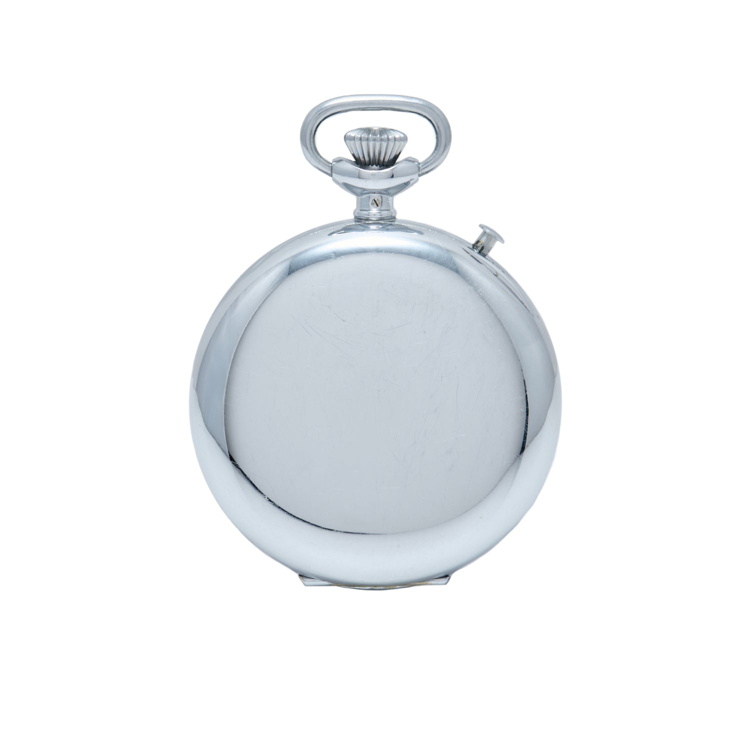Measuring 49mm in stainless steel, it features an acrylic crystal, an ornate winding and start/stop 'onion crown,' and a small reset pusher at 10:30. Its glossy white dial boasts an outer 1/5th-seconds track in black; a 30-minute register in black 'Arabic' indices; an inner 60-minute register in red 'Arabic' indices; a 15-minute recorder below 12 o'clock; and a black handset. Powered by a hand-wound Jules Racine movement with seven jewels, it even comes with its inner cloth bag and outer box.