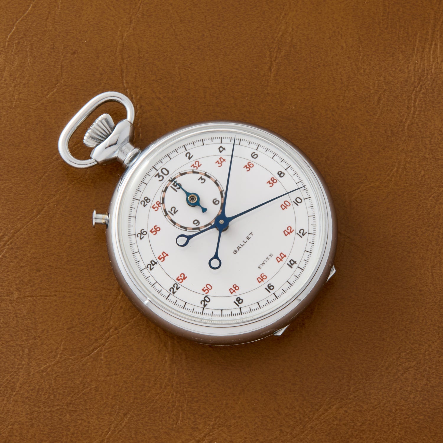 This particular timepiece is a vintage Gallet stopwatch from the mid-20th century. However, it's no typical stopwatch, but a rattrapante (or "split-seconds") model. Equipped with dual chonograph seconds hands, it can measure two events concurrently, thus differentiating between (and recording) separate lap times, for example. More complicated than your typical stopwatch, such timepieces were used to time horse or automobile races.