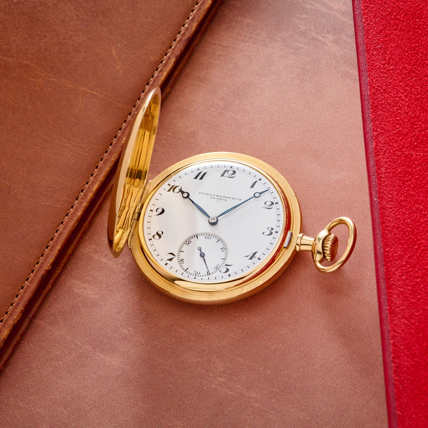 This particular pocket watch is no piece of casual horology, but a solid-gold Patek Philippe produced over a century ago. Housed in an 18K yellow gold hunter-style case measuring 49 mm, it features an ‘onion’ crown, an acrylic crystal, and a beautiful white enamel dial with black ‘Breguet’ indices, a radial subsidiary seconds register at 6 o’clock, and a matching blued steel ‘Breguet’ handset. The long "Patek Philippe & Co, Genève" signature lends it an air of old-world charm, while an included Patek Philippe silk slip cover and felt pouch help round out the package.